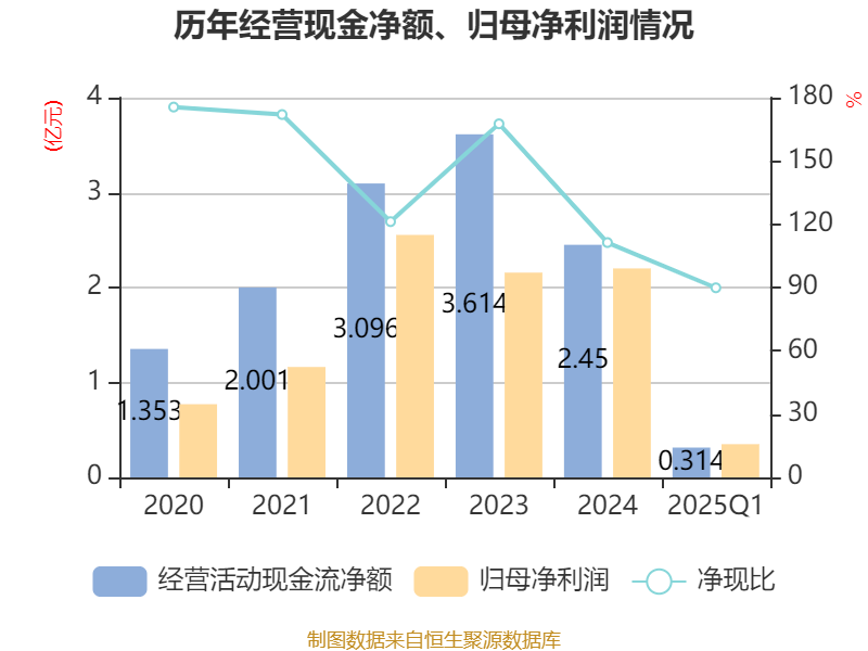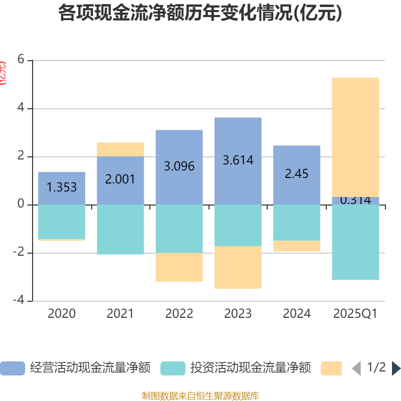 截至2025年一季度末,公司经营活动现金流净额为3143.32万元,同比下降66.77%;筹资活动现金流净额4.96亿元,同比增加5.18亿元;投资活动现金流净额-3.13亿元,上年同期为-3748.95万元。
